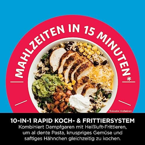 Einzelheiten: Perfekte Mahlzeiten. Ein Topf. 15 Minuten.* Mit dem Ninja Speedi 10-in-1 Schnellkocher können Sie zu Hause schnell köstliche, komplette Mahlzeiten zubereiten. Der Schnellkochmodus kombiniert Dampf mit Airfrying, um fluffige Getreidemahlzeiten, zartes Gemüse und saftiges Protein zuzubereiten – alles auf einmal. 10 Kochfunktionen: Speedi Meals, Dampf-Heißluftfrittieren, Dampfbacken, Dämpfen, Grillen, Heißluft-Frittieren, Backen/Braten, Dehydrieren, Anbraten/Sautieren, Slow Cook. Beim Dämpfen bleiben bis zu 90 % der Nährstoffe erhalten**. Airfryer: bis zu 75 % weniger Fett als bei herkömmlichen Frittiermethoden*** Dieses vielseitige Gerät eignet sich perfekt zum Garen von bis zu 4 Portionen und verfügt über einen antihaftbeschichteten, spülmaschinenfesten 5,7-Liter-Kochtopf, eine Koch- und Grillplatte und einen Küchenchef-Rezeptführer – außerdem können Sie mit dem Speedi Meal Builder Tausende von individuellen Rezepten erstellen. Ninja – Machen Sie aus Ihrer Küche eine Ninja-Küche *ohne Vorheizzeit. **Laborgeprüft mit Dampfeinstellung für Brokkoli, Paprika, Zuckerschoten für Vitamin C, Lachs für Omega3/6, Rindfleisch für Eisen. ***Getestet gegen frittierte, handgeschnittene Pommes frites.