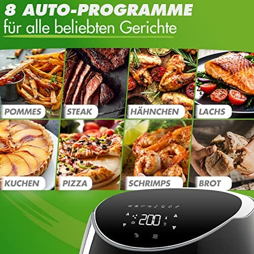 - 🔥 𝐁𝐄𝐒𝐎𝐍𝐃𝐄𝐑𝐇𝐄𝐈𝐓𝐄𝐍 🔥 Hot-Air-Twist Technologie, 2000W Power Fritöse. Extra großer X XL Garraum, Touch-Panel, Digitale Anzeige, 8 integrierte Air Fryer Garprogramme, Timer mit Signalton, Garzeit bis zu 60 min.; Temp.: 80°C – 200°C.; spülmaschinenfeste Teile.