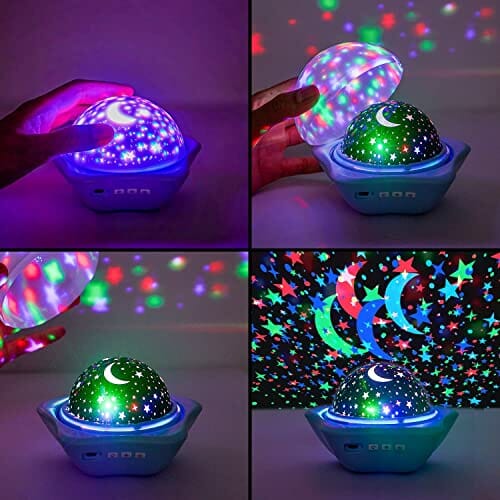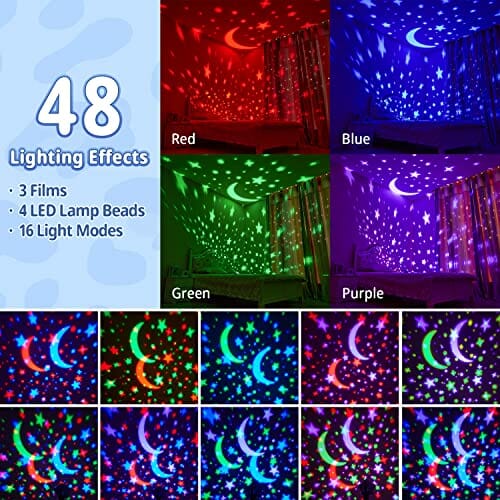 【90 Tryb Projektora: 【90 Tryb Projektora Gwiazdy Sufit Dzieci】Projektor gwiazdy sufitu dzieci ma 6 tematów projekcji kawaii: Gwiazdy i Księżyc, Światy Morskie i Dinozaur. Projektor gwiaździste niebo jest dostępny z 4 super jasnymi diodami LED (czerwony, niebieski, zielony, fioletowy). Projektor gwiazdy sufitu dzieci prz
