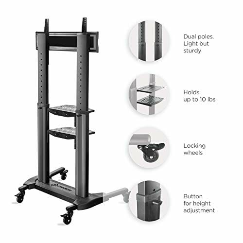 Przydatny wózek na: Przydatny wózek na telewizor | Stojak na telewizor z kółkami jest wyposażony w stalowe półki o regulowanej wysokości na dodatkowe urządzenia. Każda półka może udźwignąć do 5 kg. Szeroka podstawa i bardzo wytrzymały materiał zapewniają maksymalne bezpieczeństwo Twoich urządzeń, a stojak VESA do wózkó