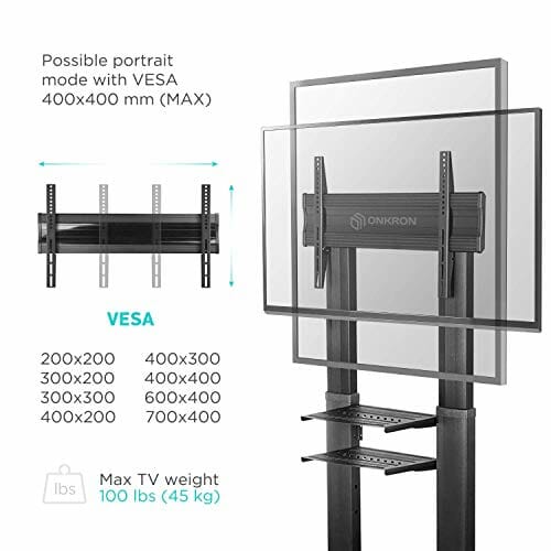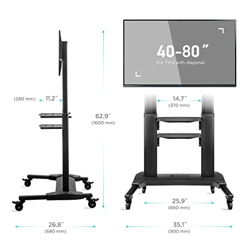 Stojak na telewizor: Stojak na telewizor z rolkami ONKRON TS2771-B z kółkami nadaje się do ekranów o przekątnej 40 – 80 cali; nośność do 55 kg. Uniwersalna podstawka pod telewizor jest kompatybilna z VESA 200 x 200 – 700 x 400 | uniwersalna podstawa TV od 950 do 1600 Regulacja wysokości w mm