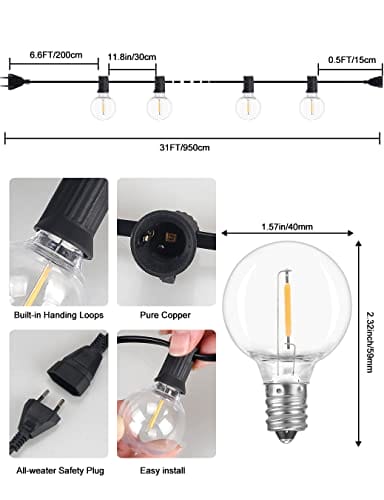 Ratowanie Energii i: Ratowanie Energii i łatwe w Instalacji: Każdy ciąg zawiera zapasowe 25pc, 1W 60 Lumen (równoważne żarówki o wartości 10W), które mogą zaoszczędzić 90% energii. Światła patio G40 można łączyć w sumie do 42 pasm, do 399 m.