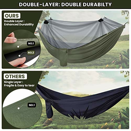- 【Einzigartige Doppelschichtkonstruktion】 Hergestellt aus doppelschichtigem 210T Nylon. Die Camping Hängematte mit integriertem Moskitonetz zum Schutz vor Moskitos, Insekten, Mücken, Fliegen