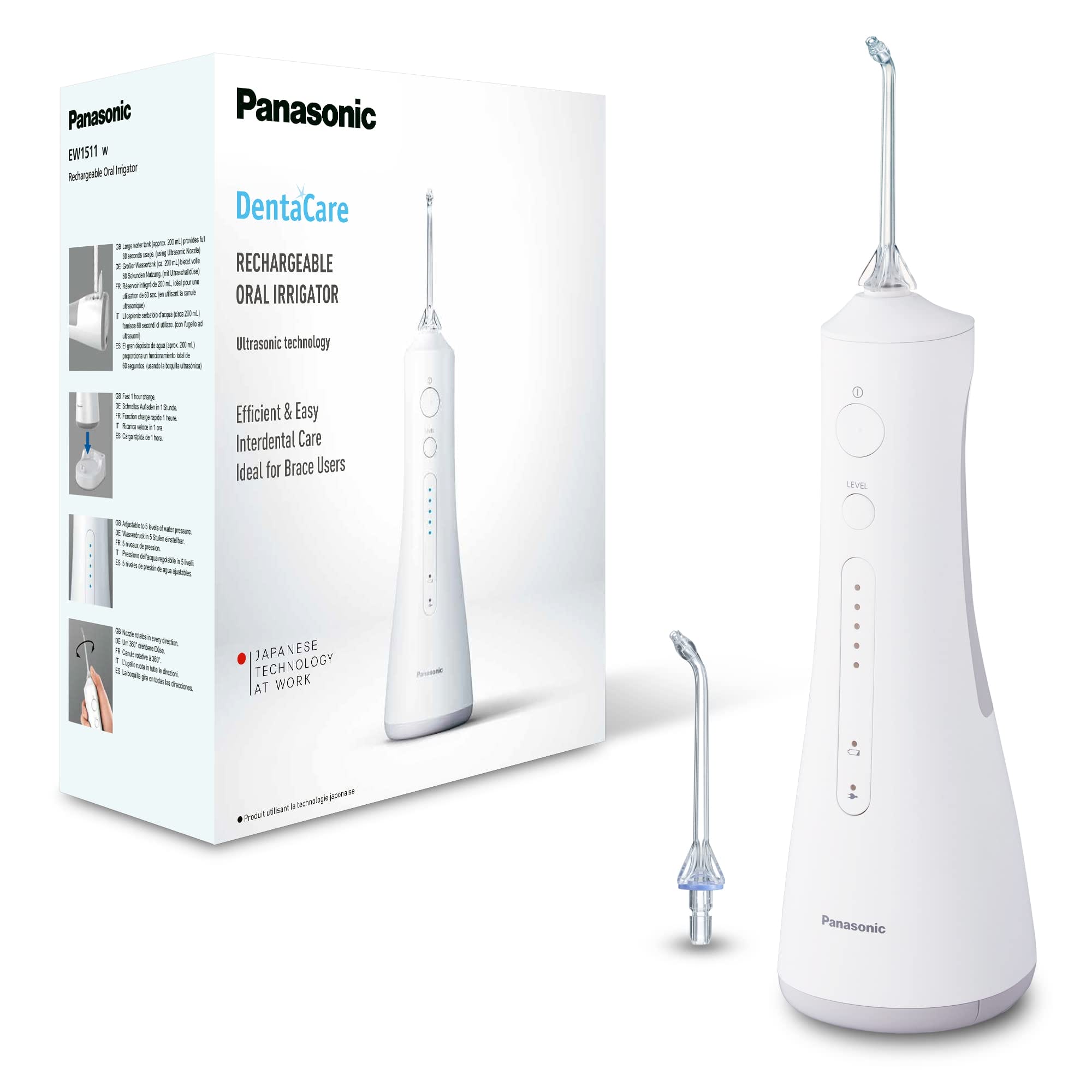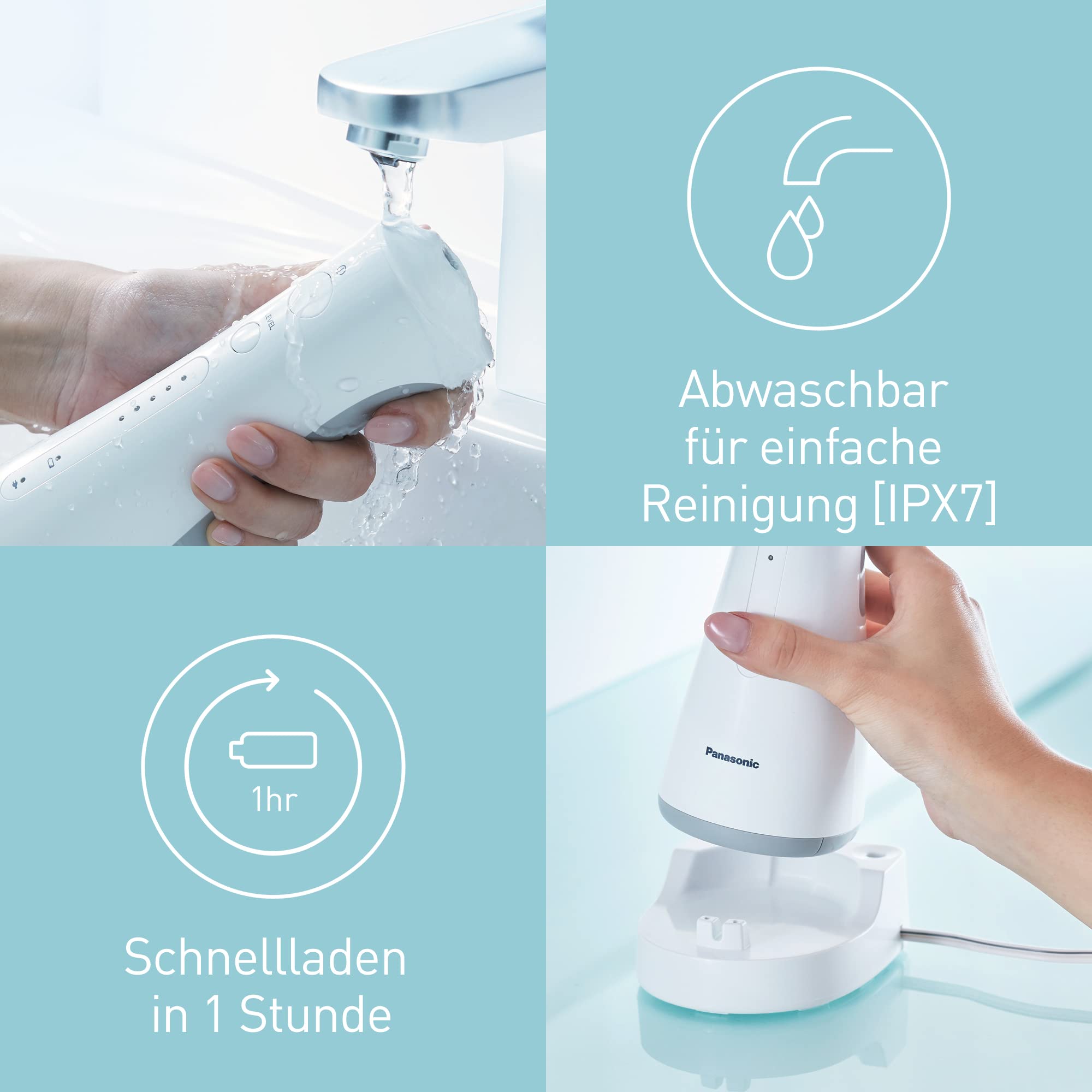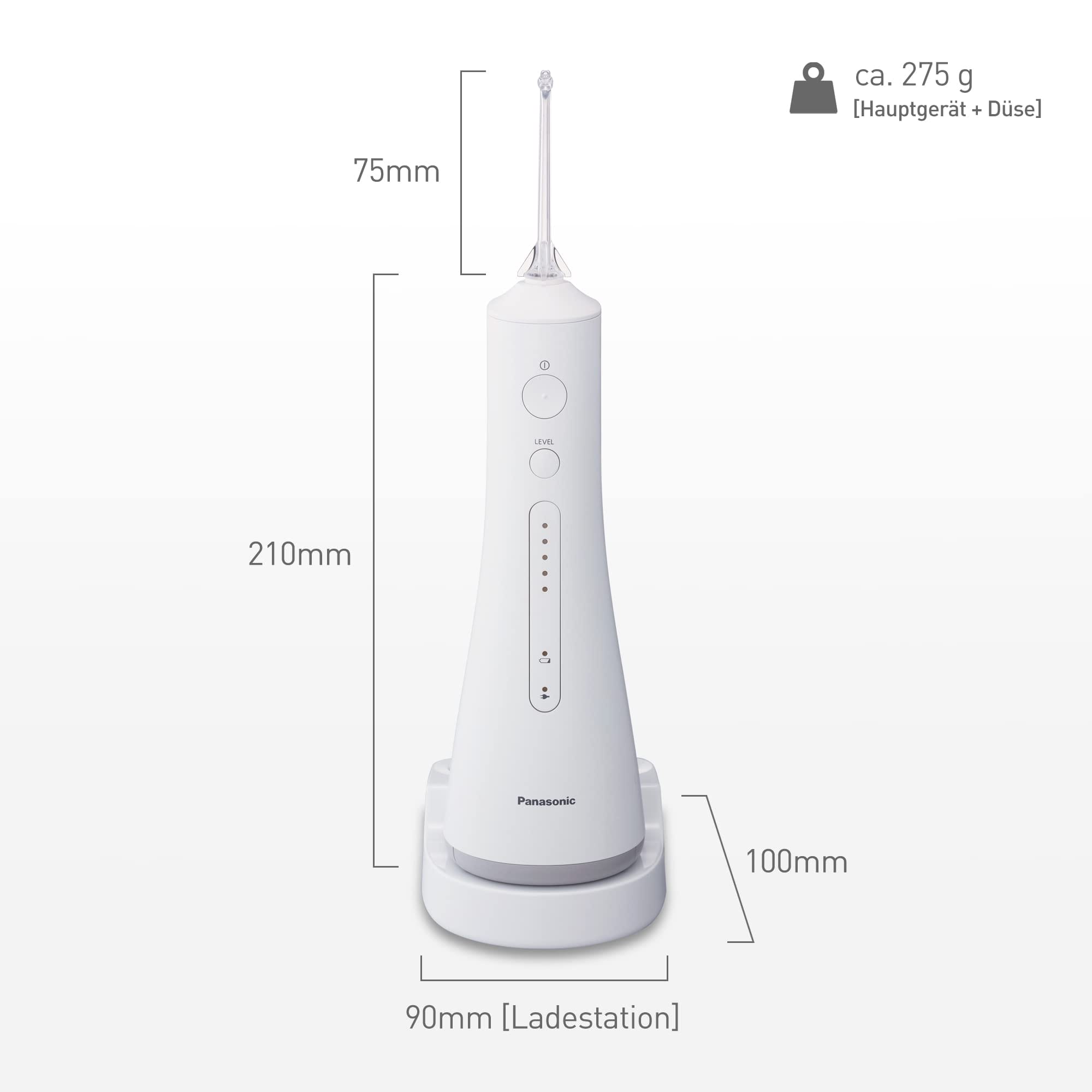 Panasonic Munddusche Ultra Sonic Stream EW1511: Die Zahnreinigung professionell im eigenen Badezimmer erledigen? Ist mit den Panasonic Mundduschen ganz einfach und komfortabel. Denn die elektrische Munddusche EW1511 ist besonders ergonomisch und passt sich an individuelle Bedürfnisse an. Sie löst Speisereste und fördert durch sanften Massagedruck die Durchblutung des Zahnfleischs. Die 5-stufige Wasserstrahlintensität sorgt dabei dafür, dass Sie die Intensität der Zahnzwischenraumreinigung genau so ausüben können, wie Sie es am liebsten haben. Neben einer gründlichen Zahnreinigung wird auch Ihr Zahnfleisch sanft massiert. Dadurch behalten Sie nicht nur weiße Zähne, sondern auch ein gesundes Zahnfleisch. Hartnäckige Speisereste in den Zahnzwischenräumen oder ein unsauberes Gefühl im Mundraum gehört mit der Panasonic Munddusche EW1511 der Vergangenheit an. Durch die Ultra Sonic Stream-Technologie dieser Munddusche wird auch Plaque in den Zahnfleischtaschen sicher entfernt. So werden mehr Speisereste beseitigt, selbst bei gleichem Wasserdruck. Der Interdentalreiniger ist deshalb auch ideal für die Pflege der dritten Zähne oder einer festen Zahnspange geeignet. Reinigen Sie mit einer Munddusche auch dort, wo Ihre Zahnbürste nicht hinkommt! Maximaler Druck: Ca. 647 kPa. Maximaler Hubwert: Ca. 1.600 U / min.