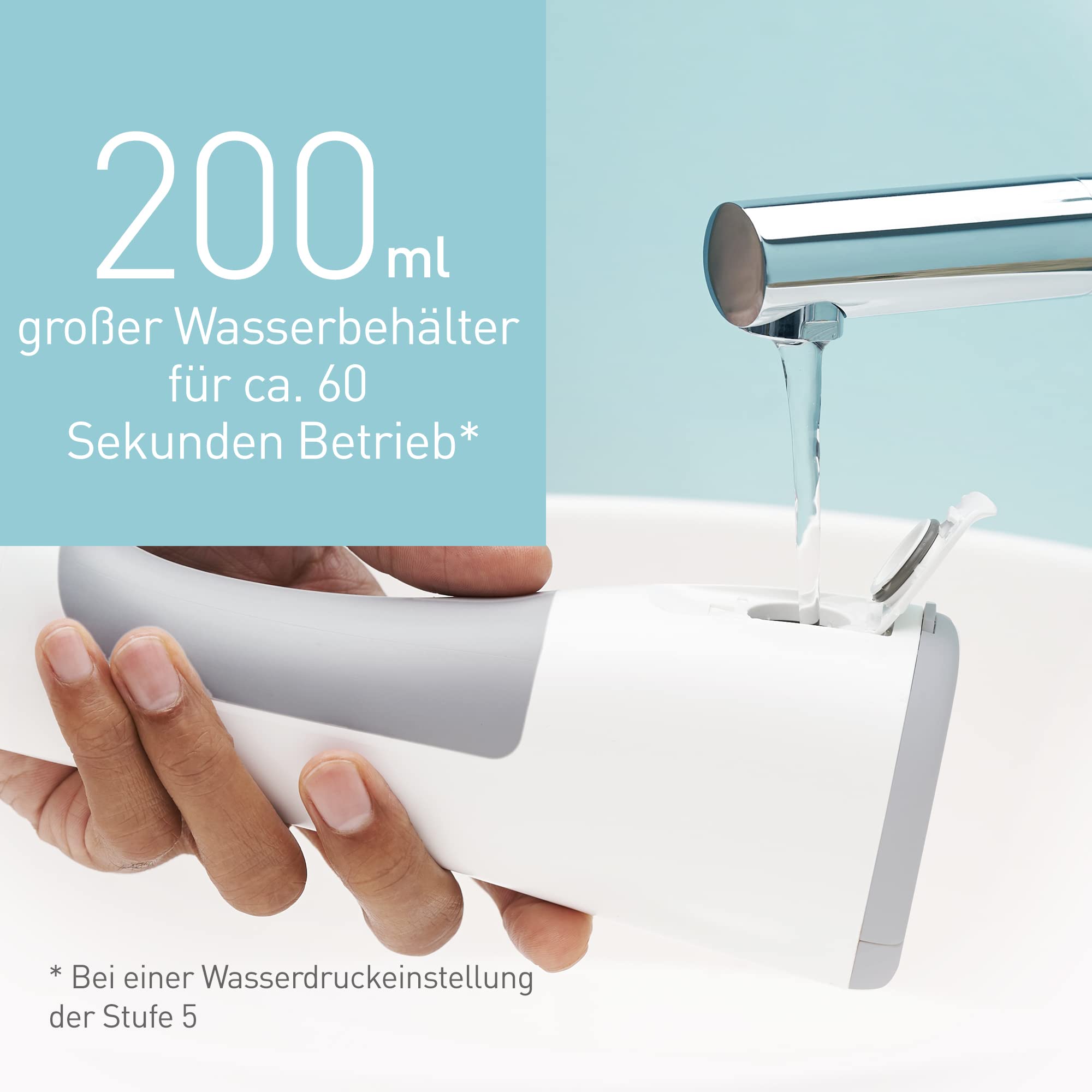- 5 WASSERDRUCKEINSTELLUNGEN: Diese Munddusche verfügt über 5 Wasserdruckeinstellungen, damit Sie die volle Kontrolle über Ihr Reinigungserlebnis haben. Die Munddusche merkt sich Ihre Einstellungen für die nächste Verwendung