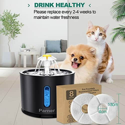 • Rozmiar pojedynczych filtrów – średnica zewnętrzna wynosi 15 cm, średnica wewnętrzna 3,5 cm. Idealnie nadaje się do fontanny dla kotów Parner „B082B4BDXB”.