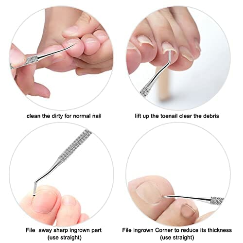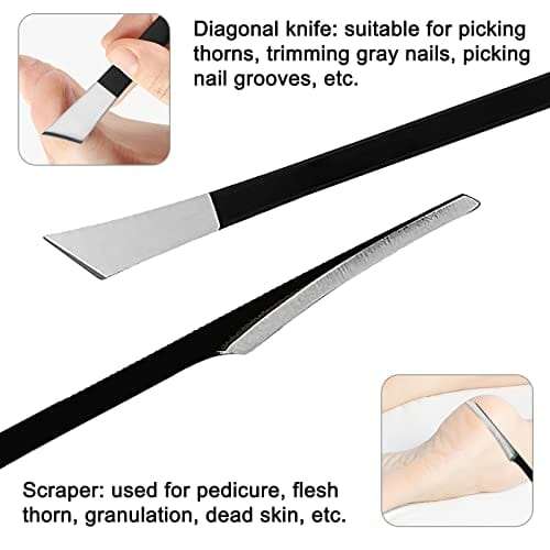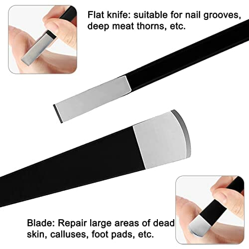 • Profesjonalne narzędzia do pedicure – zestaw noży do zrogowaciałego naskórka zawiera wiele narzędzi do pielęgnacji stóp, skrobak do zrogowaciałego naskórka, nóż do cięcia, narzędzie do pielęgnacji stóp, nóż do zrogowaciałego naskórka, skrobak do pedicure, profesjonalny zestaw noży do pedicure, podwójny pilnik i srebrny długi pilnik. Spełnia wszystkie potrzeby dotyczące pielęgnacji stóp.