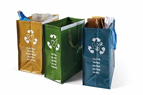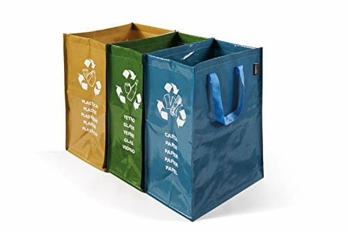 ✅ Z 3 pojemnikami:: Z 3 pojemnikami: niebieski worek do zbierania papieru (22 x 35 x 49 cm); zielony worek na szkło (26 + 20 x 35 x 49 cm); żółta plastikowa torebka (26 x 35 x 49 cm)