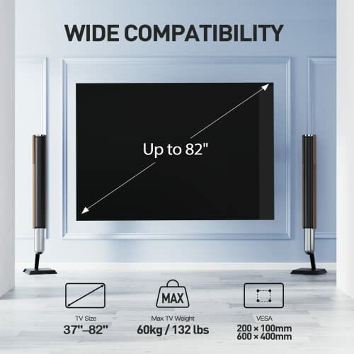 • Uniwersalna Kompatybilność – Uchwyt ścienny do telewizora pasuje do większości płaskich i zakrzywionych telewizorów od 37 do 70 cali i do 60kg. Kompatybilny z VESA (schemat otworów montażowych) 200X100mm 200X200mm 300X200mm 300X300mm 400X300mm 400X400mm 600X400mm.Prosimy sprawdzić rozmiar, wagę i VESA swojego telewizora przed nabyciem tego produktu.