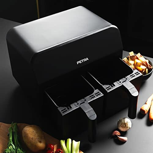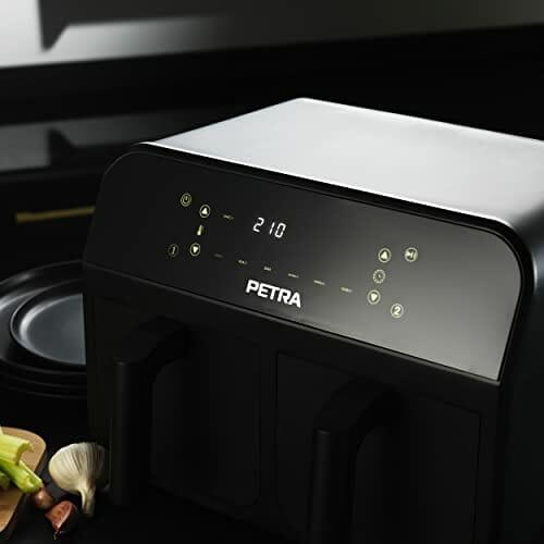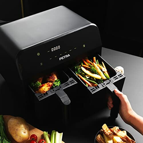 Petra PT4750BLKVDE Heißluft-Fritteuse, XXL 7,4L, 2400W Fritteuse mit 2 herausnehmbaren Frittierkörben mit Antihaftbeschichtung, 6 Kochfunktionen mit Sync & Match, 3,7 l pro Schublade, Schwarz