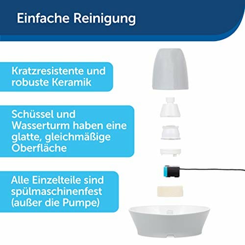 • Bardzo cicha: woda delikatnie kruszy przez wieżę do miski na wodę, a pompa jest bardzo cicha. Dzięki temu ta fontanna nadaje się również dla wrażliwych lub strasznych zwierząt domowych