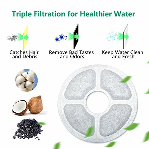 • Świeża i czysta woda – filtr zawiera węgiel aktywny i żywicę jonowymienną, które odfiltrowują zanieczyszczenia i zmiękczają wodę, dzięki czemu woda jest świeższa i czystsza. Fontanna dla kota dodaje gąbkę filtra wstępnego wokół pompy, aby lepiej filtrować zanieczyszczenia i przedłużyć żywotność pompy.