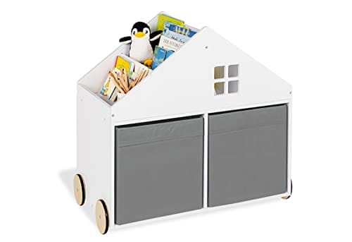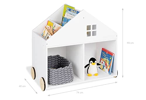 Nowoczesny design w: Nowoczesny design w kształcie domku sprawia, że regał będzie przyciągał wzrok w każdym pokoju dziecięcym. Dzięki gumowanym kółkom półkę dla dzieci można z łatwością przesuwać w przód i w tył, dzięki czemu można ją również wsunąć do innych pomieszczeń
