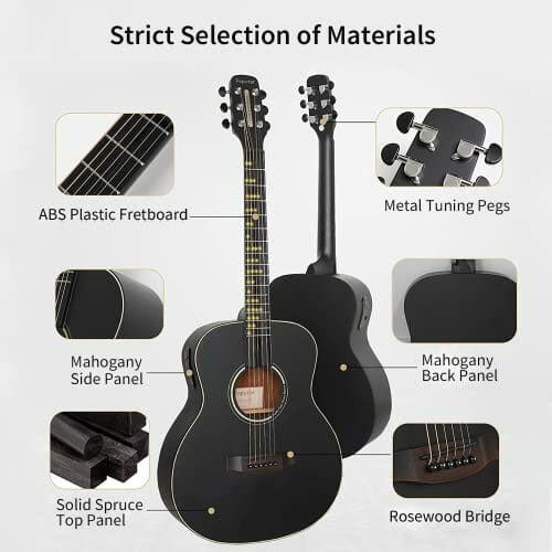 - Gut gemachte Handwerkskunst: durch die Verwendung von Fichtendecke, Mahagoniboden und Seitenwänden ist der Klang warm und rund und die Klangqualität weich. Beschichtete Saiten für einen klareren Ton und längere Haltbarkeit.