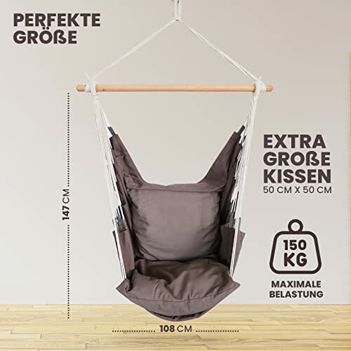 • ✅ Idealny do domu i w podróży: Fotel wiszący można szybko zwinąć i zabrać ze sobą w torbę transportową. Idealny do mieszkania, ogrodu i na taras, można go przymocować do sufitu, stelaża lub drzewa. Wymiary: 147 x 108 cm.