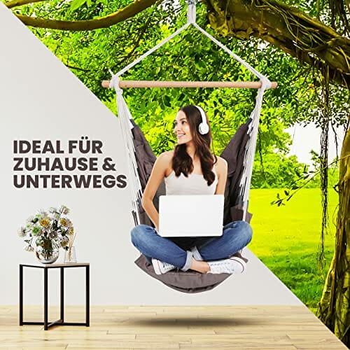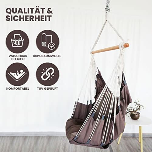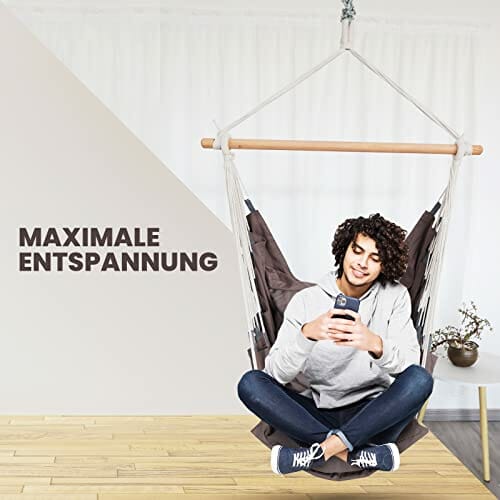 • ✅ Maksymalny relaks: W huśtawce wiszącej możesz pozwolić swojej duszy zwisać. Relaks z książką lub tabletem (zintegrowana kieszeń na książki sprawia, że jest to możliwe! ), rozkoszuj się słońcem lub słuchaj muzyki w przytulnej oazie dobrego samopoczucia