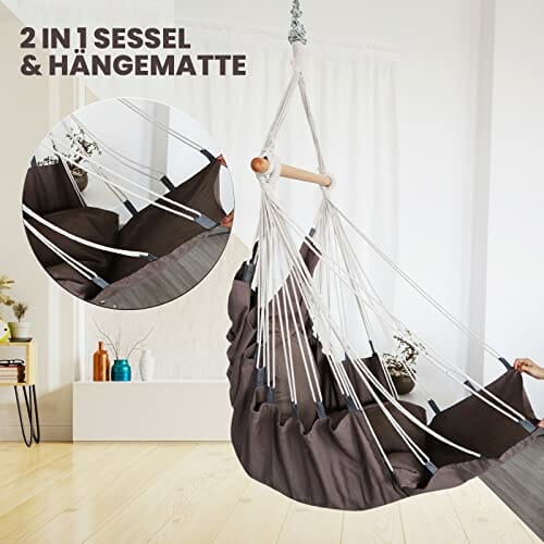 • ✅ Fotel 2 w 1 i hamak: Dzięki rozkładanemu podnóżkowi szybko zamienisz fotel wiszący w wygodną leżankę. Oprzyj się do 2 miękkich poduszek bawełnianych i pozwól sobie na stresującą codzienność za Tobą