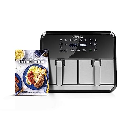 - Die Princess Heißluftfritteuse mit Doppelkorb verfügt über 8 vorgespeicherte Programme, mit denen Sie Pommes frites, Fleisch, Fisch, Krustentiere, Pizza, Kuchen und vieles mehr zubereiten können. Sie können die Temperatur und den Timer auch manuell einstellen.