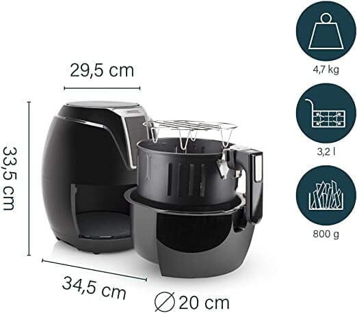 - Dank des großen Fassungsvermögens (3,2 l) genügend Pommes Frites für 5 Portionen in einem Durchgang.