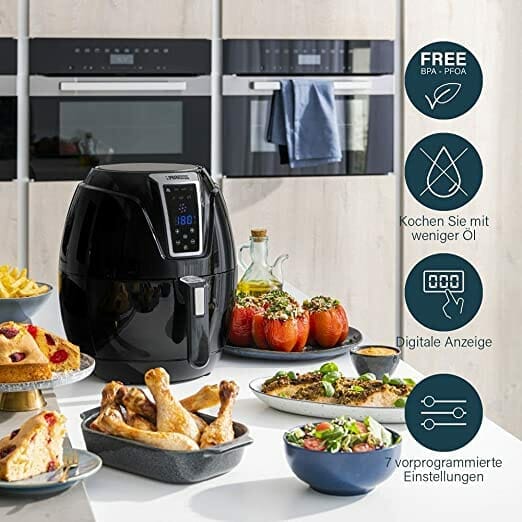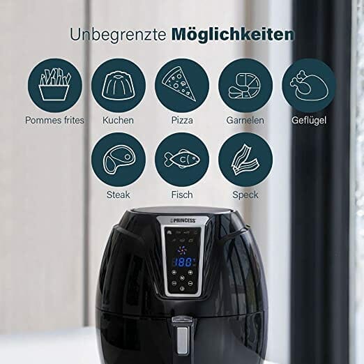 Einzelheiten: Mit dem Princess Aerofryer XL 182021 können Sie gesunde Rezepte für die ganze Familie frittieren, braten, backen, grillen, kochen und rösten. Mit einem Fassungsvermögen von 3,2 Litern können bis zu 5 Portionen knusprige und köstliche Pommes Frites in einem Durchgang zubereitet werden. Durch das digitale Display und die 7 vorprogrammierten Einstellungen gelingt die Zubereitung im Aerofryer schnell und macht einfach Spaß. Nie war es so einfach, ein gesundes Essen zu zaubern, dass die gesamte Familie mag.
