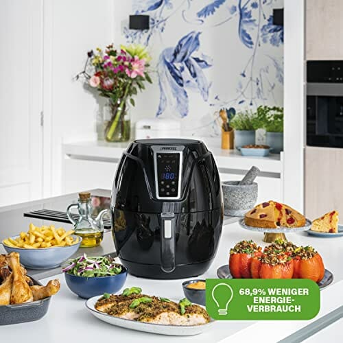 - Sparen Sie bis zu 68,9% Energie in Ihrem Haushalt, wenn Sie diese Princess Heißluftfritteuse verwenden. Die Berechnung basiert auf einem Vergleich zwischen einem herkömmlichen 3300-W-Backofen und unserer Heißluftfritteuse. Sie werden nicht nur weniger Energie verbrauchen, sondern Ihr Essen wird auch viel schneller garen.
