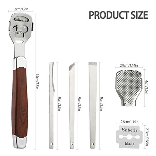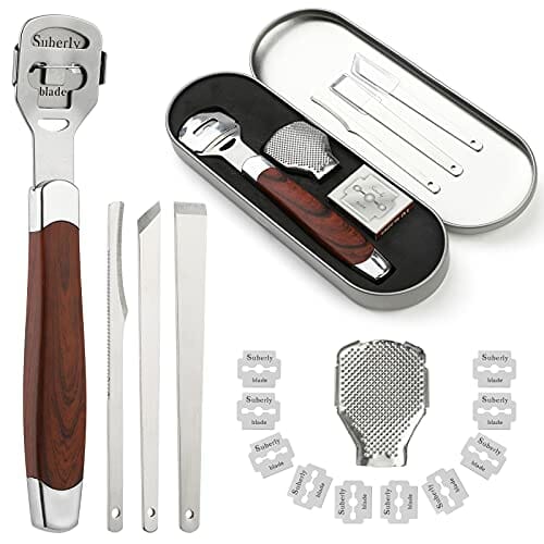 Zestaw pilników do: Zestaw pilników do stóp do pedicure – frez do pielęgnacji stóp w zestawie 1 x golarka do zrogowaciałej skóry z drewnianym uchwytem i 1 x zapasowa głowica pilnika, 3 x skrobak do pedicure z różnymi funkcjami i 10 zapasowymi ostrzami. Ten profesjonalny zestaw do usuwania zrogowaciałego naskórka spełni