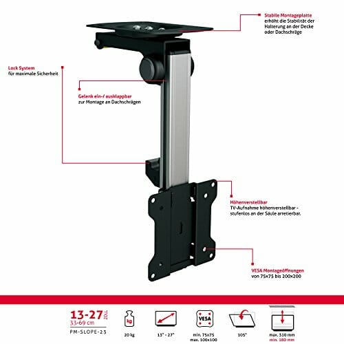 PureMounts PM-SLOPE-23 Premium uchwyt sufitowy do telewizora, optymalny do skosów dachowych, możliwość pochylenia maks. 105°, regulacja wysokości, nośność: maks. 20 kg, VESA do 100 x 100, uniwersalny
