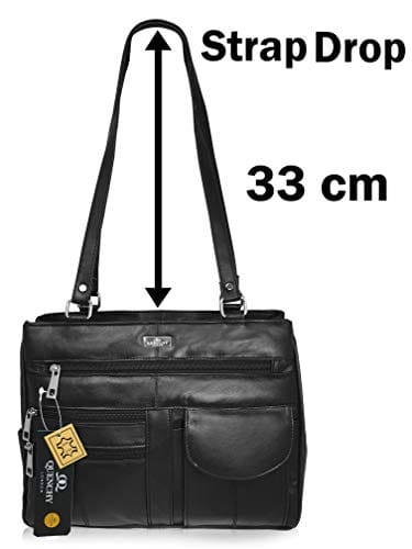 Diese Damen Handtaschen mit Doppelgriff aus hochwertigem weichem schwarzem Leder von Quenchy London sind stilvoll und äußerst praktisch. Diese Handtasche für Frauen verfügt über 8 Taschen und große Fächer. Die beiden Hauptfächer der Handtasche sind in voller Länge und voller Höhe mit Reißverschluss. In einem Fach befindet sich eine kleine Reißverschlusstasche, die andere eine kleine Handytasche. Auf der Vorder- und Rückseite dieser Designer-Handtaschen befinden sich fünf weitere Taschen in verschiedenen praktischen Größen, davon 2 fast volle Höhe und Länge, 4 mit Reißverschluss.