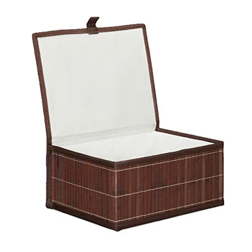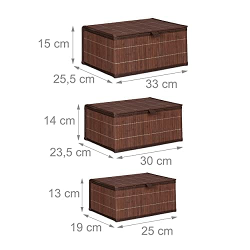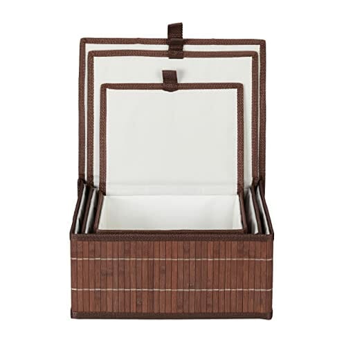 Relaxdays Kosz do przechowywania 3-częściowy zestaw, pokrywka i wkładka z materiału, bambus, łazienka, zabawka, pudełko do przechowywania, 3 rozmiary, brązowy
