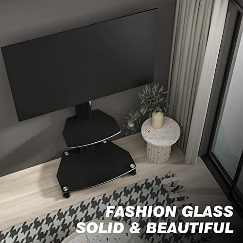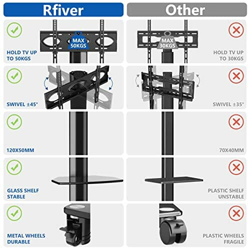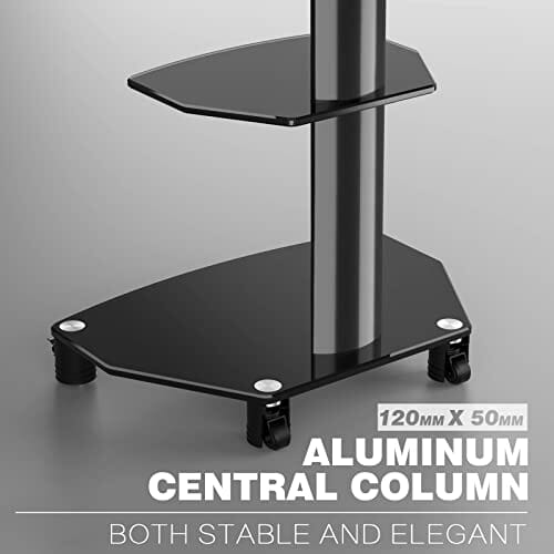• Bardziej stabilny – ten stojak na telewizor z kółkami wykonany jest z aluminiowych kolumn, które są mocniejsze, dzięki czemu mogą utrzymać telewizory do 50 kg. Półki ze szkła hartowanego zapewniają miejsce do przechowywania akcesoriów audio wideo, odtwarzaczy Blu-Ray i DVD, konsoli do gier, soundbarów itp.