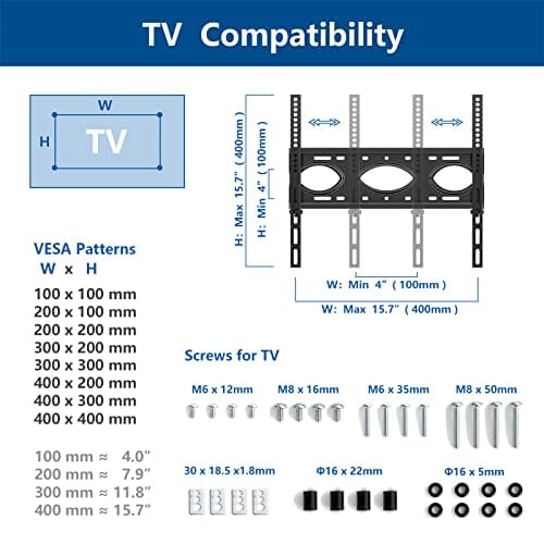 • Kompatybilność – kompatybilne wzory otworów montażowych VESA z tyłu telewizora (szer. x wys.) 100 x 100 – 400 x 400 mm. Ten uniwersalny stojak na telewizor na kółkach nadaje się do większości płaskich zakrzywionych telewizorów o średnicy 27 do 65 cali. Zestaw zawiera wszystkie niezbędne śruby i inne akcesoria w oddzielnych opakowaniach, a także przejrzystą instrukcję graficzną.