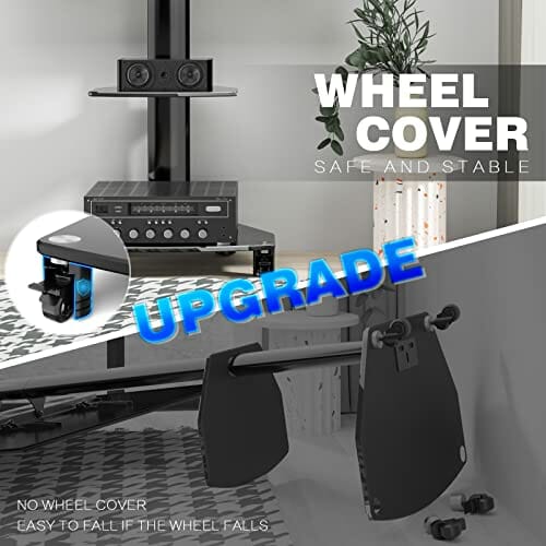 • Ulepszona wersja – koła są wyposażone w osłony ochronne, aby zwiększyć bezpieczeństwo. Nie musisz się martwić, że koła spadną. Może również zapobiegać kopaniu kół i chronić stopy. Zapewniamy 5-letnią gwarancję na ten stojak pod telewizor.