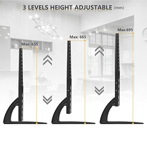 Regulowana wysokość –: Regulowana wysokość – dzięki stojakowi możesz ustawić swój telewizor w 3 poziomach regulacji wysokości, maksymalnie 695 mm.
