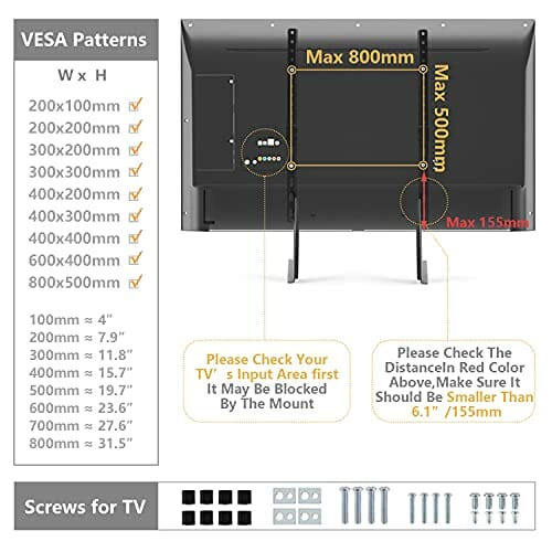 Kompatybilność TV –: Kompatybilność TV – pasujące wymiary VESA, takie jak 800 x 500 / 800 x 400 / 600 x 400 / 500 x 300 / 400 x 400 / 400 x 200 / 400 x 300 / 300 x 300 / 300 x 200 / 200 x 300 / 200 x 200 / 200 x 100 mm. Do telewizorów LED OLED o przekątnej 20-65 cali.