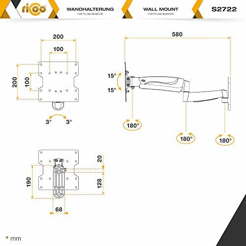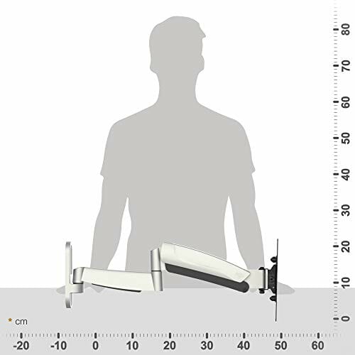 • Właściwości: ten uchwyt do monitora jest obracany o 180 stopni przy maks. szerokości ekranu 100 cm. Zakres nachylenia ramienia monitora +/-15 stopni. Odległość od ściany uchwytu ściennego elastyczna 55-580 mm. Płyta przednia obracana +/-3 stopni