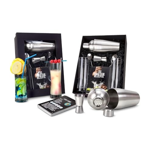 Römer Präsente zestaw upominkowy do koktajli: 8-częściowy shaker do koktajli pudełko na przepisy na koktajle 2 szklanki do longdrinków łyżka i 1 miarka barmańska w czarnym pudełku prezentowym.