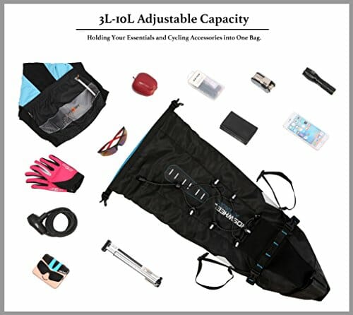 • Regulowana wysoka pojemność: pojemność można regulować od 3 l do 10 l (1-2,6 galony) za pomocą torby na kółko. Pojemność jest prawie jak mała torba do stojaka. Żaden bagażnik rowerowy to żaden problem! Może pomieścić to, czego potrzebujesz. Jedna torba to wystarczy!