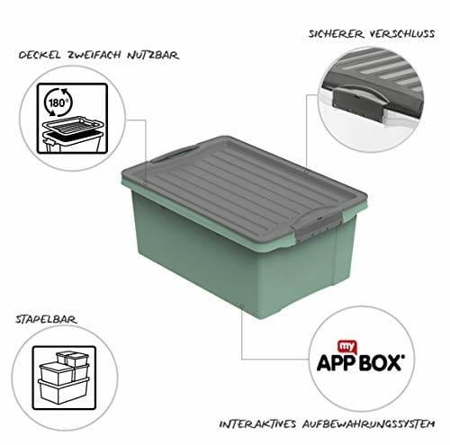 • Zakres dostawy: 1 x pudełko z tworzywa sztucznego Compact 13 litrów z pokrywką w kolorze zielonym/antracytowym – nie zawiera BPA – bezpieczne układanie w stos dzięki dwustronnej pokrywce – wyprodukowane przez Rotho