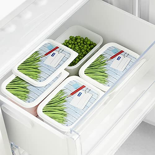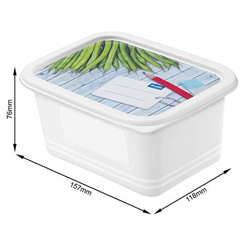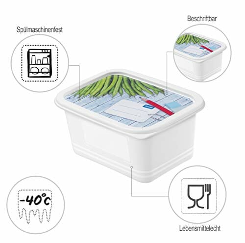 • Materiał: tworzywo sztuczne polipropylen/plastik (puszka PP, pokrywka PE) – nie zawiera BPA – nadaje się do zamrażania do -40° – Kolor: białe pojemniki do zamrażania, biała pokrywka – z motywem nadającym się do ponownego zapisania na pokrywce