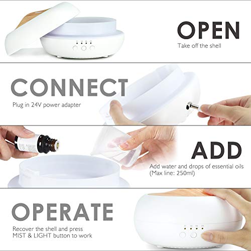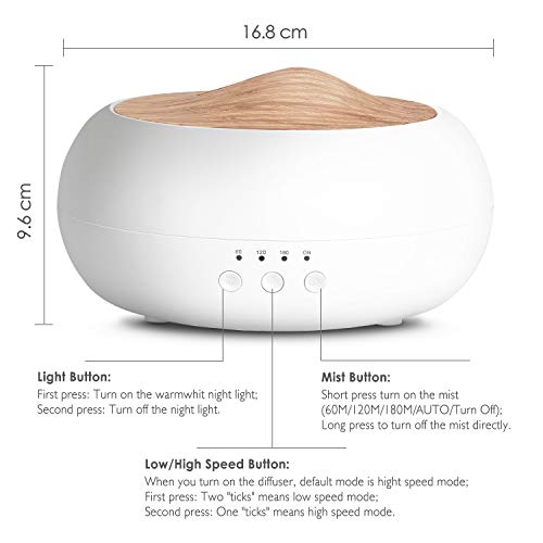 Lampka w kolorze: Lampka w kolorze ciepłej bieli. Dyfuzor produkujący drobą/intensywną mgiełkę: ten dyfuzor olejków eterycznych emituje spokojne i ciepłe światło, tworzy spokojną i delikatną atmosferę podczas pracy, czytania, nauki lub spania. Dyfuzor może wytwarzać tylko mgiełkę, nie ma konieczności jednoczesnego ko