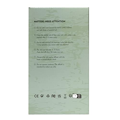 ✅ Tryb timera i: Tryb timera i wyłączenie w przypadku braku wody: Dyfuzor zapachów do olejków eterycznych ma 4 tryby ustawienia czasu: 0,5 godz. / 1 godz. / 2 godz. / 3 godz., wł./wył.; dyfuzor do olejków eterycznych o pojemności 100 ml może pracować przez 3-5 godzin. Dyfuzor wyłącza się automatycznie, gdy w środku