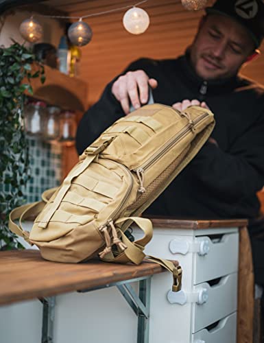 • Plecak: wykonany z poliestru 1050D. Jest bardzo wytrzymała i odporna na ścieranie. Kieszenie zapewniają wystarczająco dużo miejsca na bukłak i wszystko, co ważne, co masz przy sobie