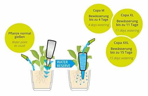 • Łatwa obsługa: 1. Roślina podlewa jak zwykle 2. Włóż zbiornik wody do wilgotnej ziemi 3. Napełnij zbiornik wody wodą