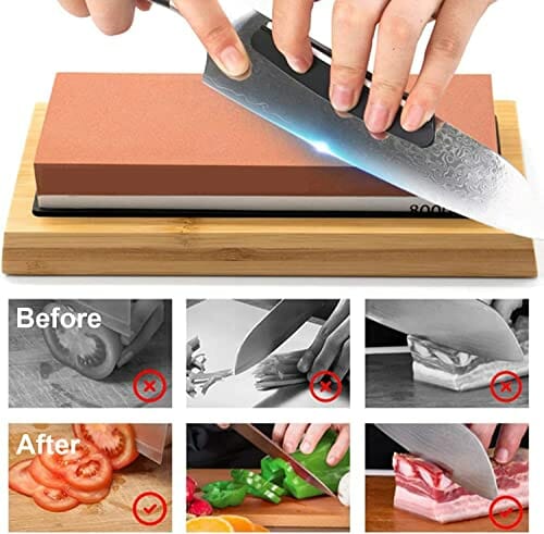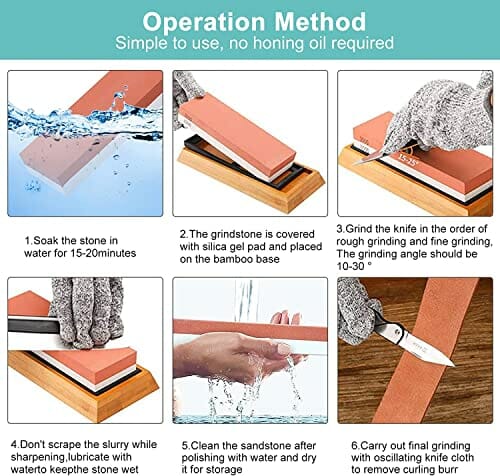 ✅ Zastosowanie – namocz: Zastosowanie – namocz kamień szlifierski przez 5-10 minut, następnie przymocuj kamień do antypoślizgowej bambusowej podkładki silikonowej, użyj prowadnicy kątowej, aby zamocować nóż, utrzymuj kąt 15-20°, pocieraj przez 10-20 minut, a następnie poleruj skórzanym paskiem do ściągania lub skórzaną płyt