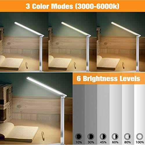 • 【18 opcji oświetlenia i obsługa dotykowa】Ta ściemniana lampa biurkowa z ochroną oczu jest wyposażona w 3 tryby świecenia (3000-6000 K), 6 poziomów jasności, bez migającego oświetlenia. Łącznie dostępnych jest 18 opcji oświetlenia. Można go dopasować za pomocą czułego ekranu dotykowego, aby sprostać wymaganiom różnych sytuacji, takich jak praca, nauka, czytanie, rysowanie, dzierganie, relaks itp.
