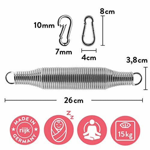 • Zestaw sprężyn kołyskowych dla niemowląt: zawiera sprężynę spiralną i dwa karabińczyki – wszystko do bezpiecznego, optymalnie kołyszącego się mocowania huśtawki dla niemowląt, fotela wiszącego, worka do siedzenia, hamaka lub hamaka.