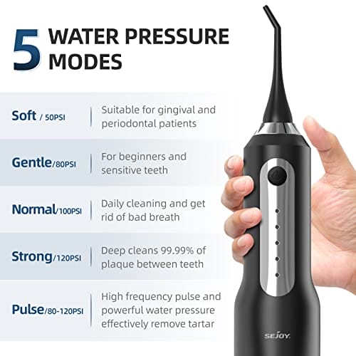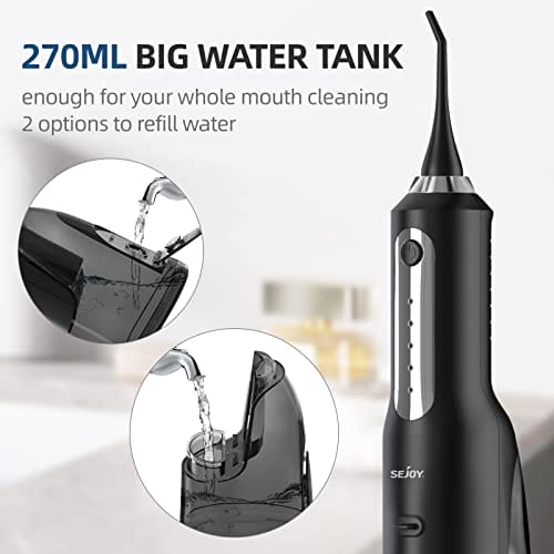 • Duża pojemność 270 ml i wyjmowany zbiornik na wodę: irygator Sejoy o dużej pojemności 270 ml, może być używany nieprzerwanie przez 90 sekund, wystarczy do czyszczenia całego jamy ustnej bez wielokrotnego napełniania wodą. Dzięki zdejmowanej konstrukcji zbiornika czyszczenie wnętrza zbiornika na wodę jest łatwiejsze. Wodoodporna konstrukcja IPX7, zapobiega wyciekom wody, może być używana do łazienki pod prysznicem.