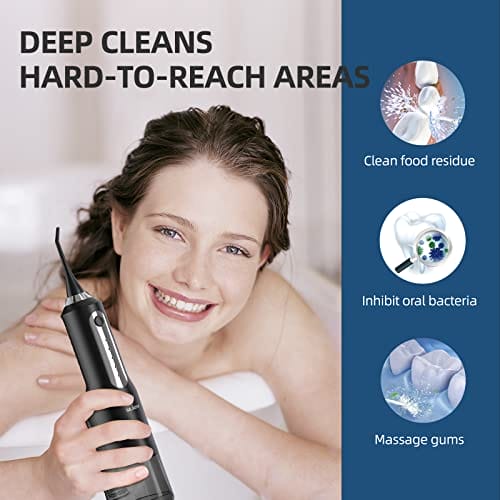• Głębokie czyszczenie zębów: irygatory wodne do zębów wykorzystują ulepszoną profesjonalną technologię pulsacji i ergonomiczną konstrukcję, która pomaga oczyścić każdy kącik ust. Ten system nici dentystycznej usuwa resztki jedzenia i plamy, których nie są w stanie usunąć konwencjonalne szczoteczki do zębów i nici dentystyczne, pomaga poprawić zdrowie zębów i dziąseł, skutecznie masuje dziąsła i wspomaga krążenie krwi.