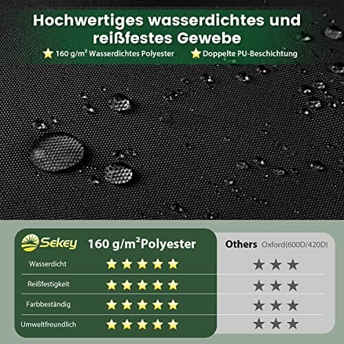 - 【HOCHWERTIGES MATERIAL】 Die Sekey Abdeckplane für Gartenmöbel besteht aus hochwertigem 160g/m² Polyestergewebe, das nicht anfällig für Verblassen ist. Im Vergleich zu Oxford-Stoff (600D/420D) bietet es einen besseren Schutz vor Wasser, Regen und UV-Strahlen.