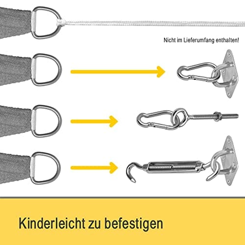 • 𝗕𝗘𝗙𝗘𝗦𝗧𝗜𝗚𝗨𝗡𝗚𝗦𝗦𝗘𝗜𝗟𝗘 𝗜𝗡𝗞𝗟𝗨𝗦𝗜𝗩𝗘 – Die mitgelieferten 3 strapazierfähigen Polypropylen Befestigungsseile, sorgen für eine kinderleichte Befestigung der Sonnensegel. Durch die eingenähten langlebigen und nicht rostenden Edelstahlringe an jeder Seite gelingt Ihnen die Anbringung sehr schnell.
